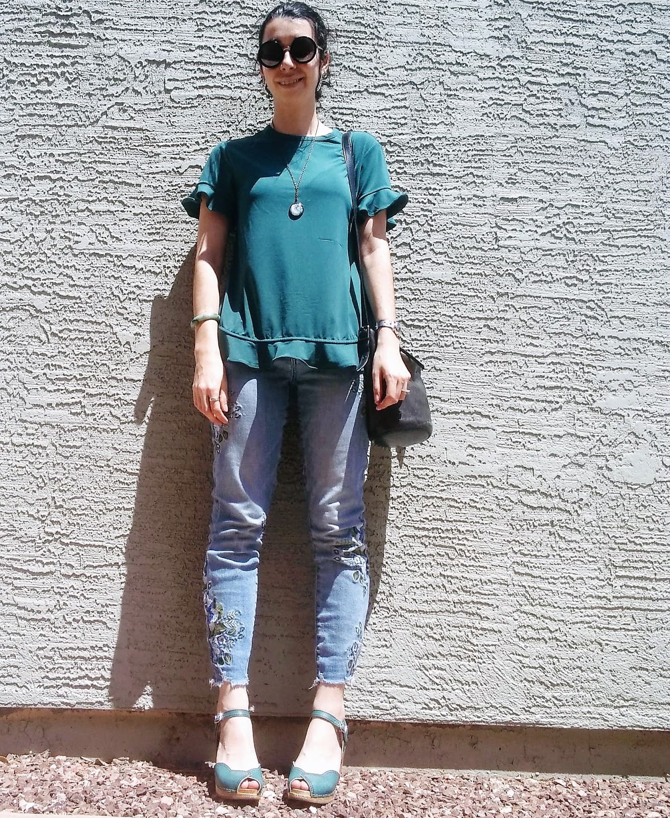 I chose my go-to fun jeans with lots of floral embroidery and matched my shoes and top (I'm pretty sure I posted in this combo before or an outfit very similar but it's good to wear what you like and not waste clothes, right?). Turquoise blue/green is definitely my favorite color. I have a bag that would've matched but all my stuff was already in my mom's hand-me-down bucket bag and I didn't want to be too overly matchy. My surgeon's appointment was pretty early so I didn't feel like putting together a complete and fussy lewk if you know what I mean! Also, anybody else out there love a good keyhole detail in the back?